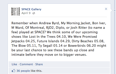 Some shows are just magical, and this was definitely one of them. I am not a spontaneous person—a creature of habit and advance planner by nature, I am actually really surprised I ended up at this show at all. I was perusing my Facebook news feed on a Monday afternoon and saw a brilliant post by SPACE Gallery. It reminded us how Andrew Bird, My Morning Jacket, Bon Iver, Of Montreal, and Josh Ritter (just to name a few amazing acts) played at SPACE before moving on to play much bigger venues. They suggested that upcoming shows (such as Lost In The Trees) would be our “last chance to see these bands up close and intimate before they move on to bigger venues.” I already liked Lost In The Trees, so decided to take SPACE’s advice and go to the show.