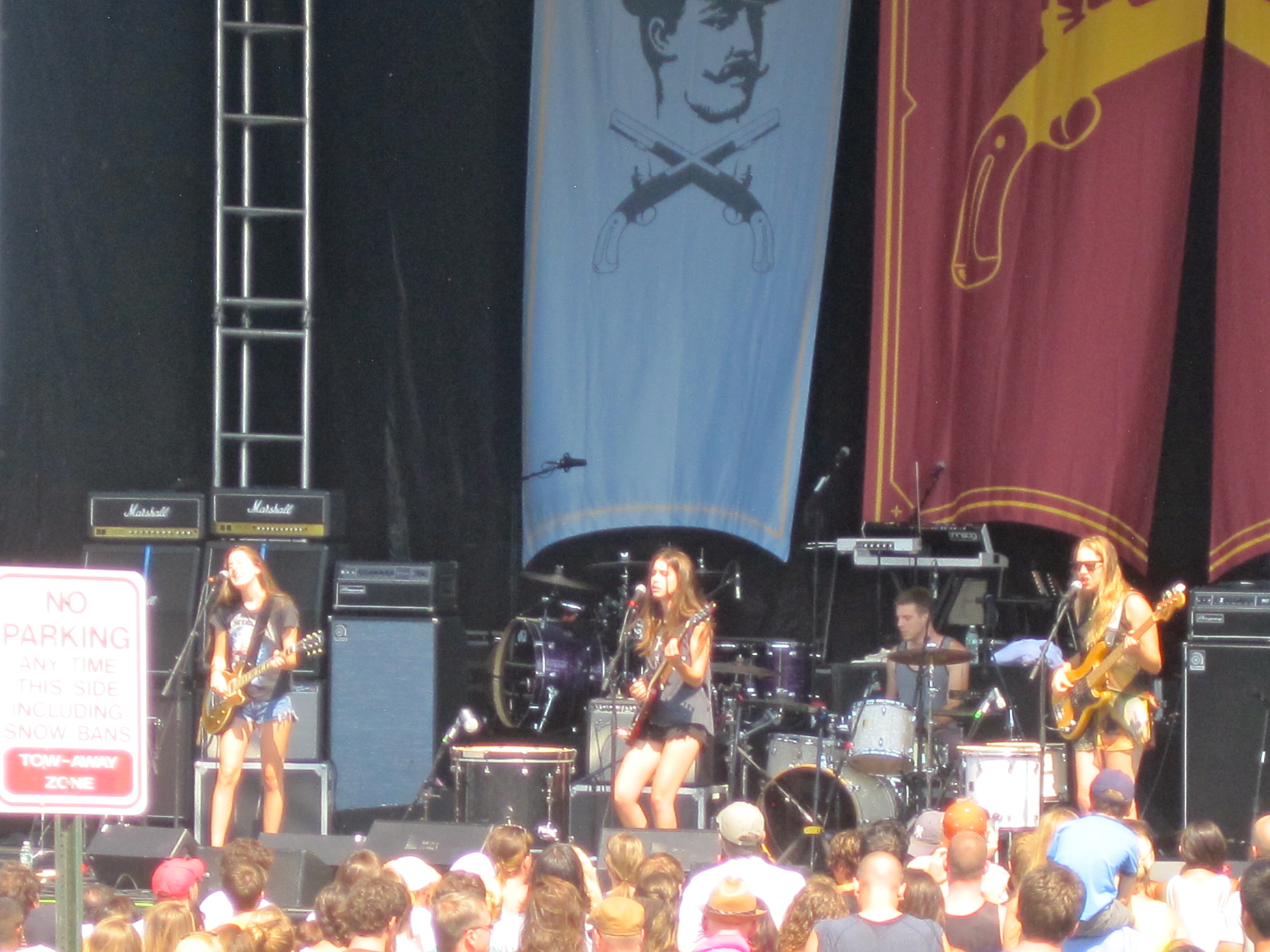 Haim took the same stage after Simone Felice (there went my theory about alternating stages) and are three sisters from California. My friends Bartlett and Monica had joined us by then and Bartlett joked that “those girls just passed AP English.” They were obviously young—late teens to early twenties—but one of them had a very strong, mature voice for her age. One of the sisters pushed the envelope a bit—joking about vodka and inviting people to skinny dip with them later—I found her stage banter a bit distracting. One of their songs that was unlike the others reminded me of Gloria Estefan and Miami Sound Machine. Overall, the girls wanted to rock and can, even if I didn’t really connect with their music. They wrapped their set with a strongly percussive song and one of the sisters grabbed a drumstick and banged on the drum with a lot of enthusiasm. Like I’ll say a lot (or maybe I’ll just say it here and be done with it)—none (few?) of these acts had the stage presence to really engage a crowd of 15,000+ people but all might be really great in a smaller venue. It’s hard to tell and I probably won’t go out of my way to see m/any of them again given this first impression.