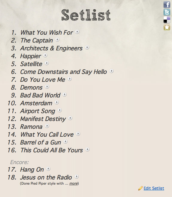Ryan told us how weird it was for them to be playing for a seated audience, encouraged dancing, and also gave a few shout outs to the folks who’d come out at midnight to set up their chairs for the show. A guy made his way through the front of the crowd early in the set and Ryan called him out and joked a little with him about how he must know someone who works at L.L.Bean to get a seat like that (and called him the 1%). Ryan also worked to remember that there were a lot of kids in the audience, so had to do some quick editing on stage. I thought it was sweet when he pointed out the sign language interpreter and joked that it was too much power for him to have a microphone and a human puppet. He asked her name and then asked if she had to sign everything he said. When Meryl nodded yes, Ryan said “I’m Meryl and I’m awesome and deserve a raise!” It was very cute.