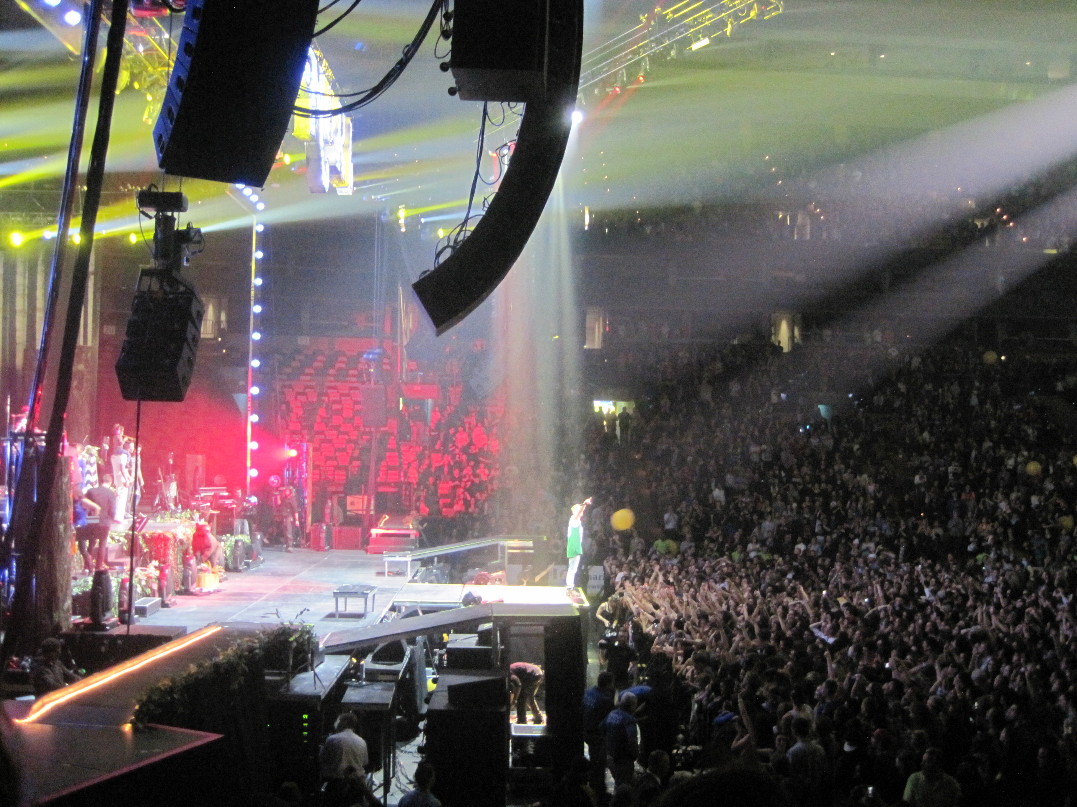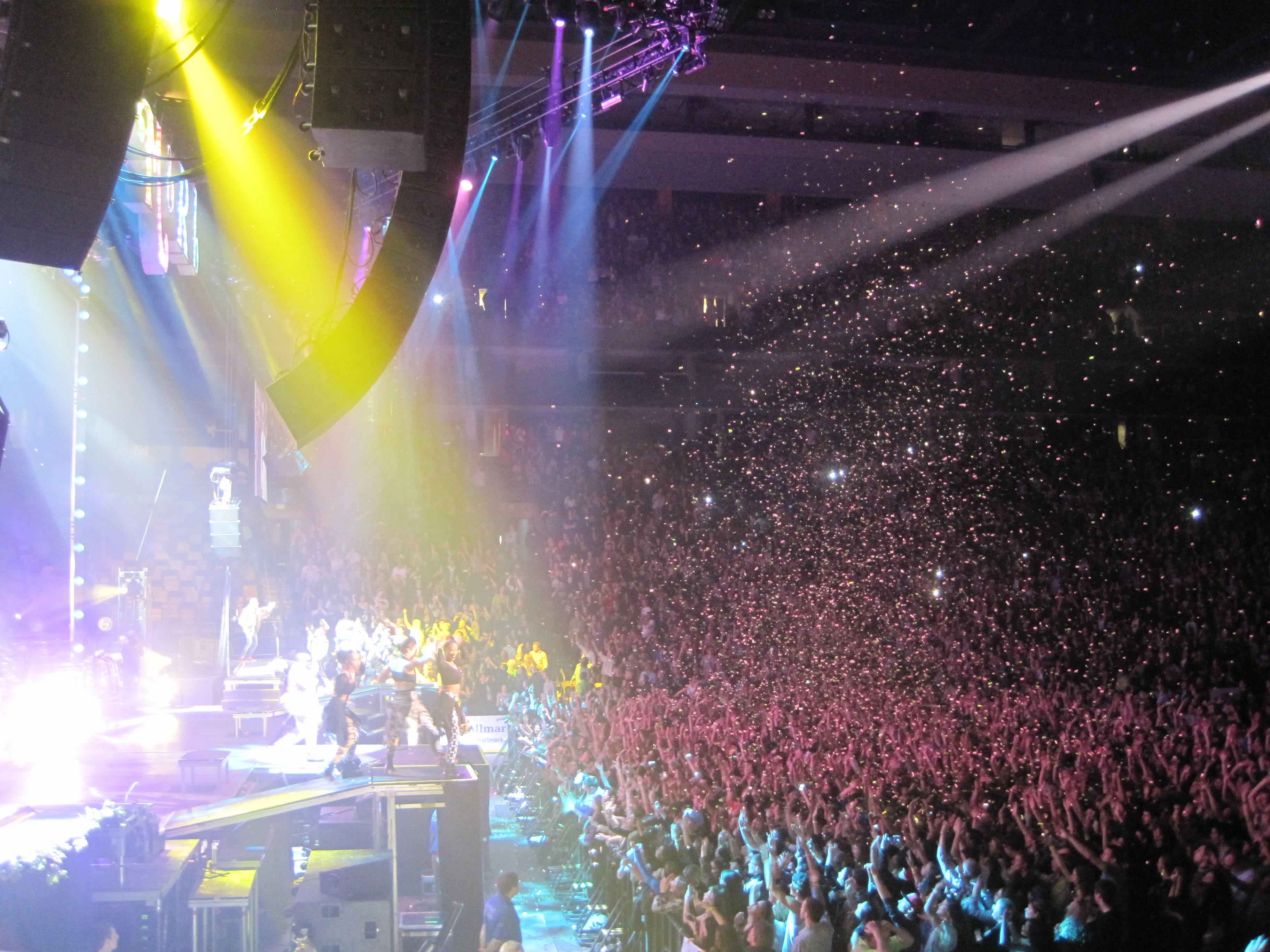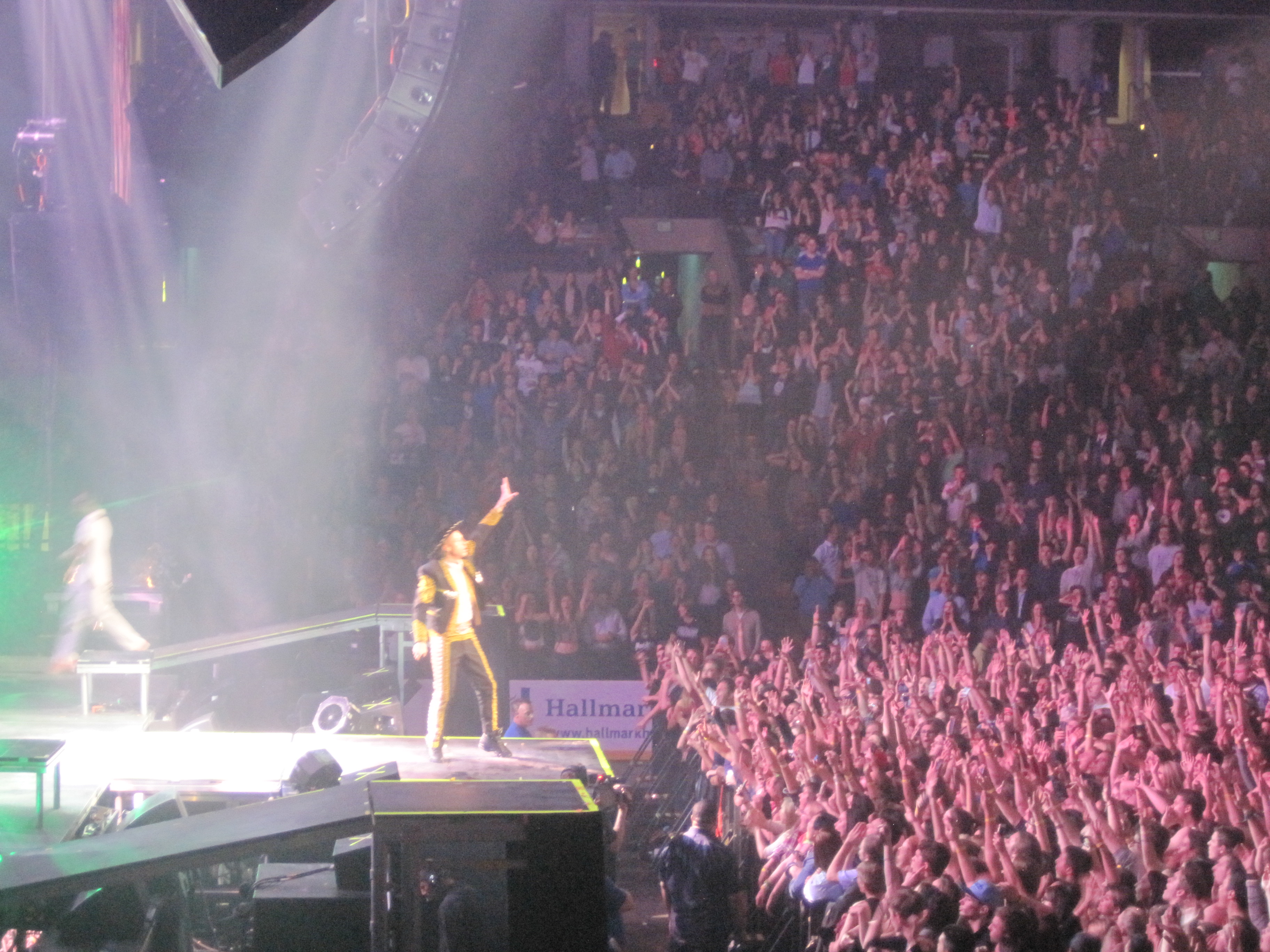 The best part of the night, I thought, was when they pared down to just Zach, Brian, and Kanene around one microphone for a few numbers. The first of these, “Watch Over Us,” was the showstopper for me. Brian on lead vocals, Zach and Kanene supporting. Brian’s performance was so charged and emotional that when he sang, “But my baby’s sleeping,” then paused for at least four beats, the whole crowd was si-lent. That is hard to do. No “woos”. No jackass shouting “yeah!” or “ow!” Silent. Because we were right up front, I know why he paused–he was catching his breath. It’s not often that you see a singer expend that kind of energy, but man he was wringing himself out on that song.