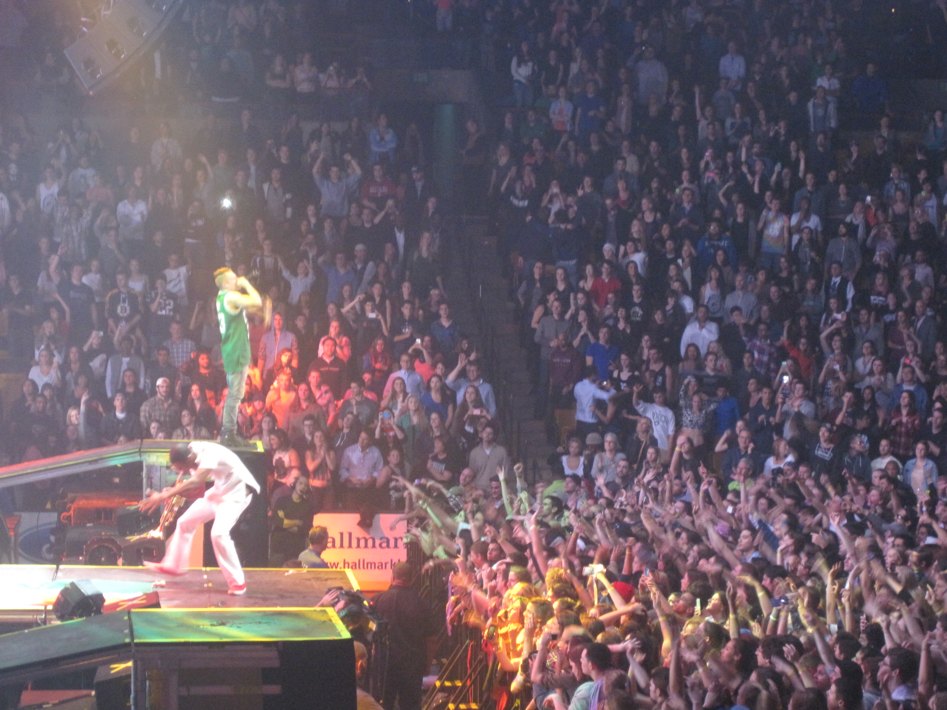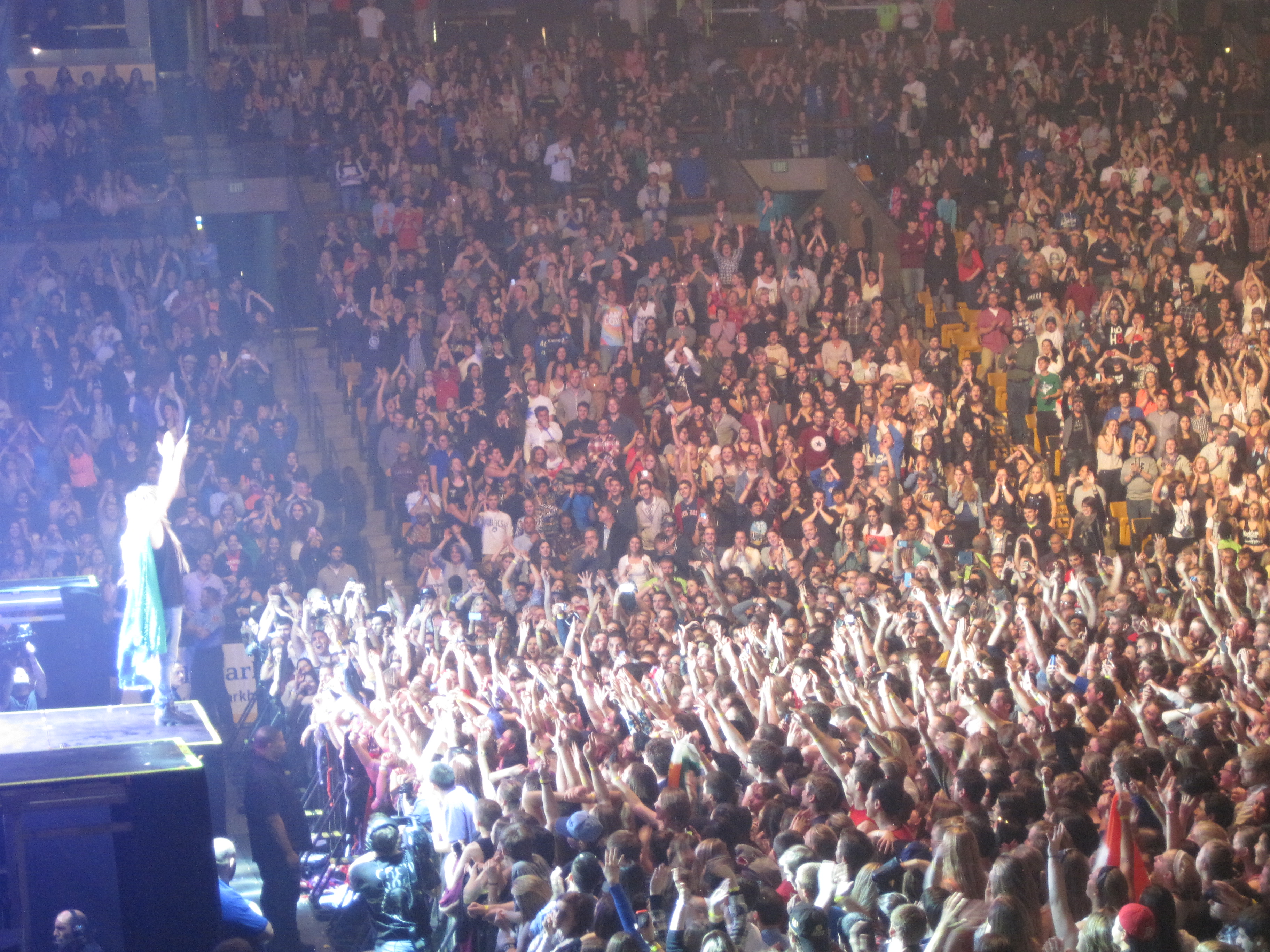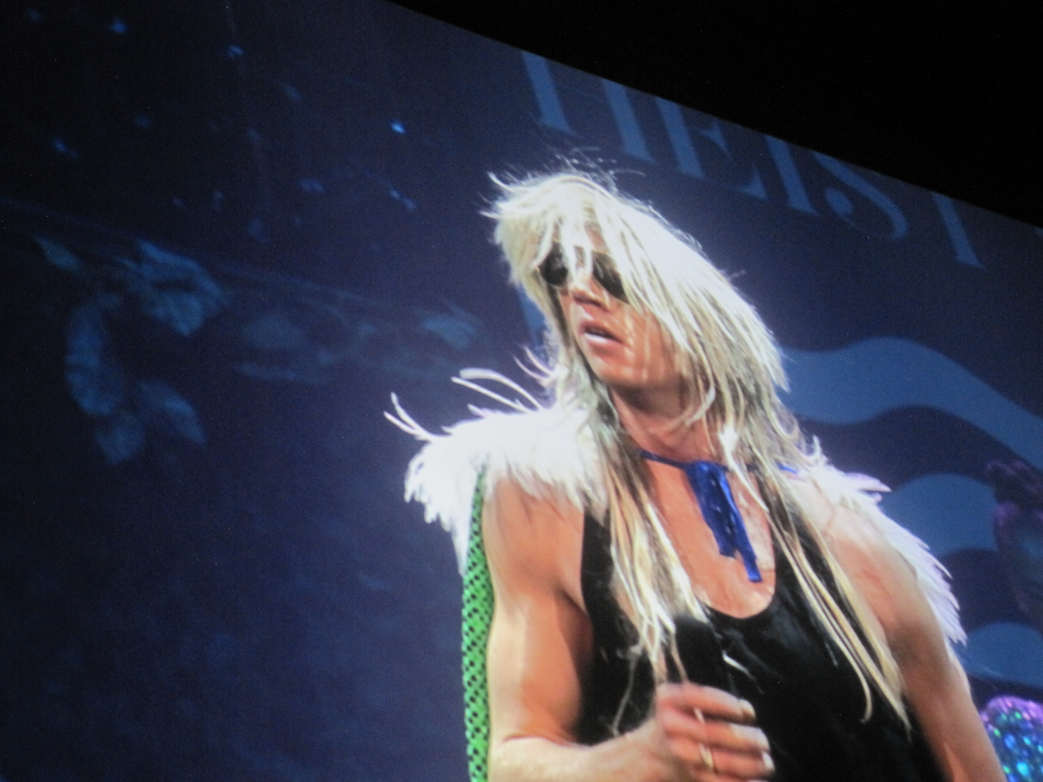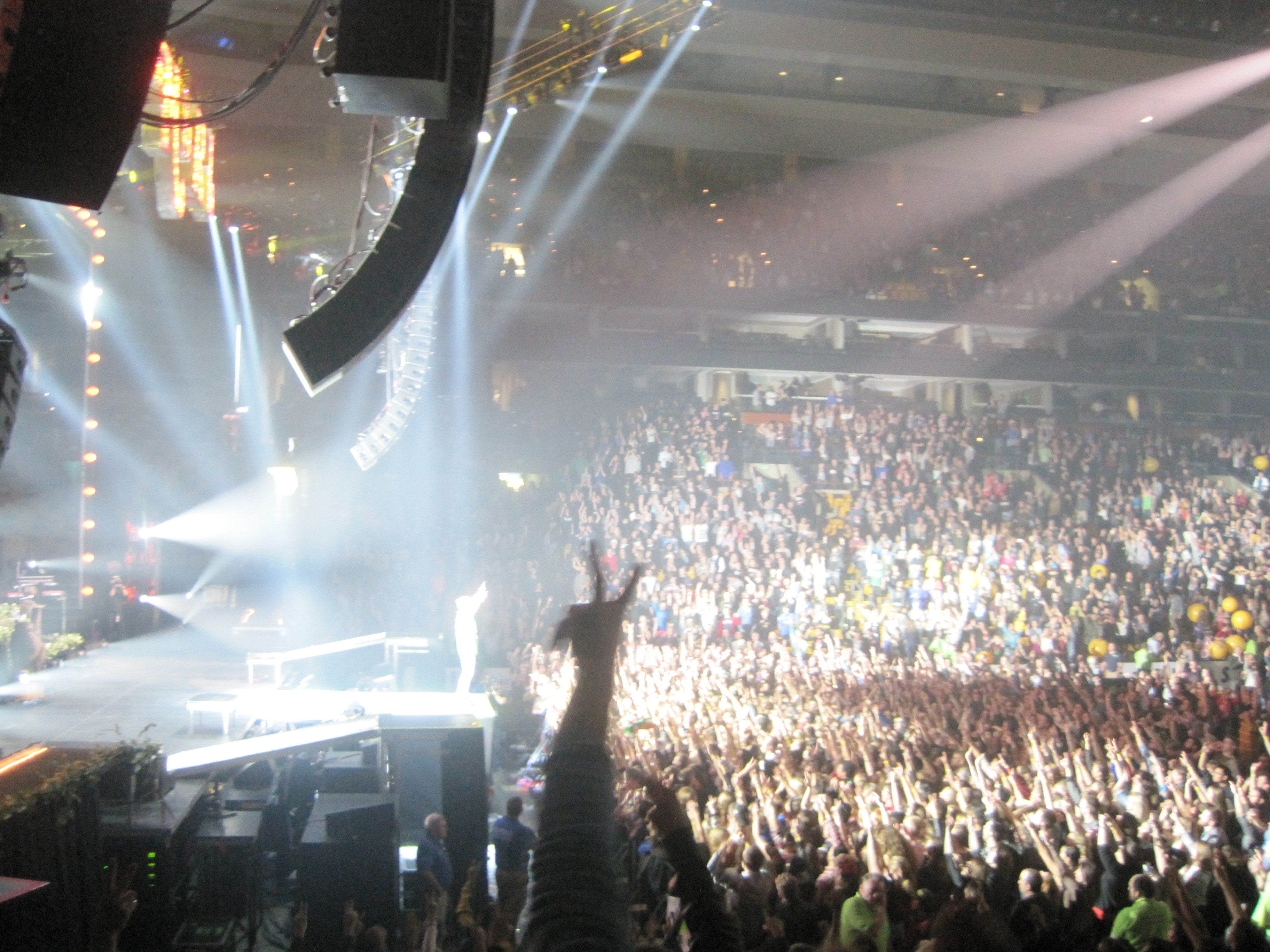 The best part of the night, I thought, was when they pared down to just Zach, Brian, and Kanene around one microphone for a few numbers. The first of these, “Watch Over Us,” was the showstopper for me. Brian on lead vocals, Zach and Kanene supporting. Brian’s performance was so charged and emotional that when he sang, “But my baby’s sleeping,” then paused for at least four beats, the whole crowd was si-lent. That is hard to do. No “woos”. No jackass shouting “yeah!” or “ow!” Silent. Because we were right up front, I know why he paused–he was catching his breath. It’s not often that you see a singer expend that kind of energy, but man he was wringing himself out on that song.