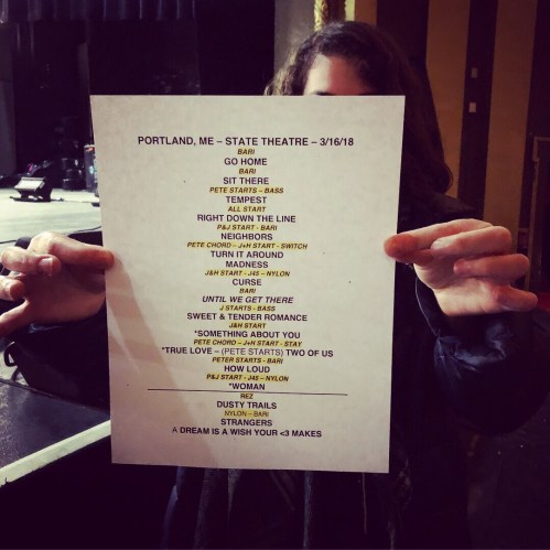 “This band and us working together has been the power of collaboration. The power of creating something that’s greater than ourselves as individuals that’s positive. We do that with our writing. We have two heads and two hearts lending perspective within one song and we have two voices making one voice and we have our whole band putting on a show together for you guys and at the end of the day, we wouldn’t be here without you, so thank you very much. We feel the power and love that you give to us and it fuels us to be able to do what we do and in having spent so much time together the thing that we’ve learned is that our greatest dream of all is that you each take something from this experience that we are all sharing tonight that you need–whether it’s joy or bittersweetness or sorrow or pain or love or humor–and you take it out into your everyday lives and pay it forward. Share it with a neighbor in the form of love because it may sound repetitive to say this, but it is all we need right now. No matter where you go, do something positive with this.”