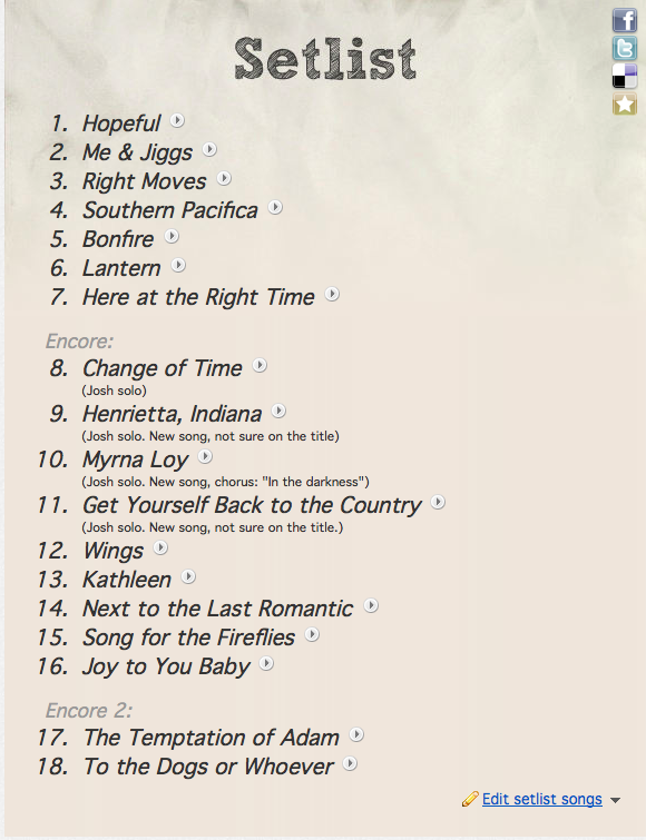 They said goodnight, but came back to serenade us with “The Temptation of Adam” and to rock out on “To the Dogs or Whoever.” My friend Colin (who I met because of whatbreesees.com–lucky me!) posted a set list from the night on setlist.fm (in case you’re curious about what you missed). So glad for a much needed night out with good friends and good music.