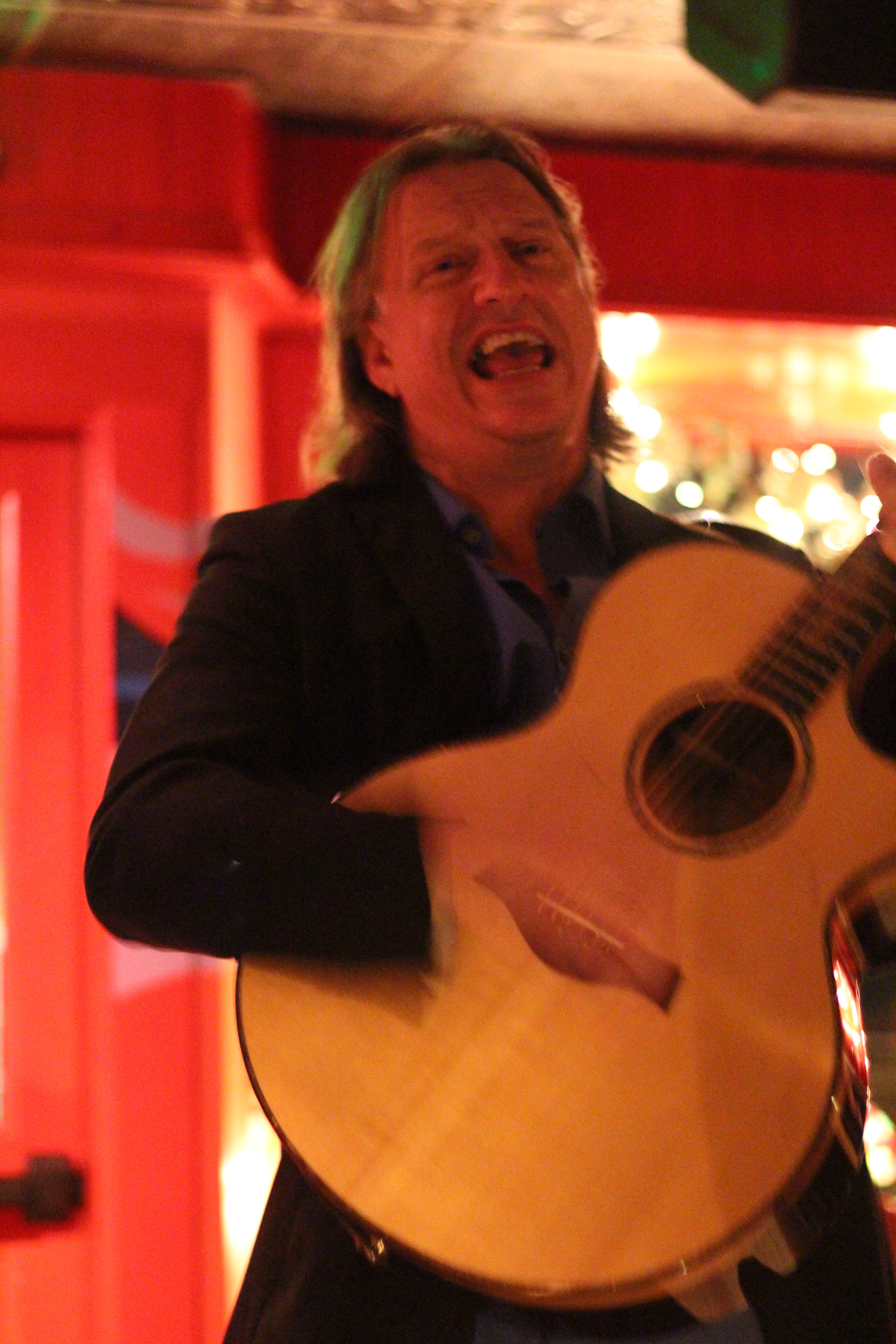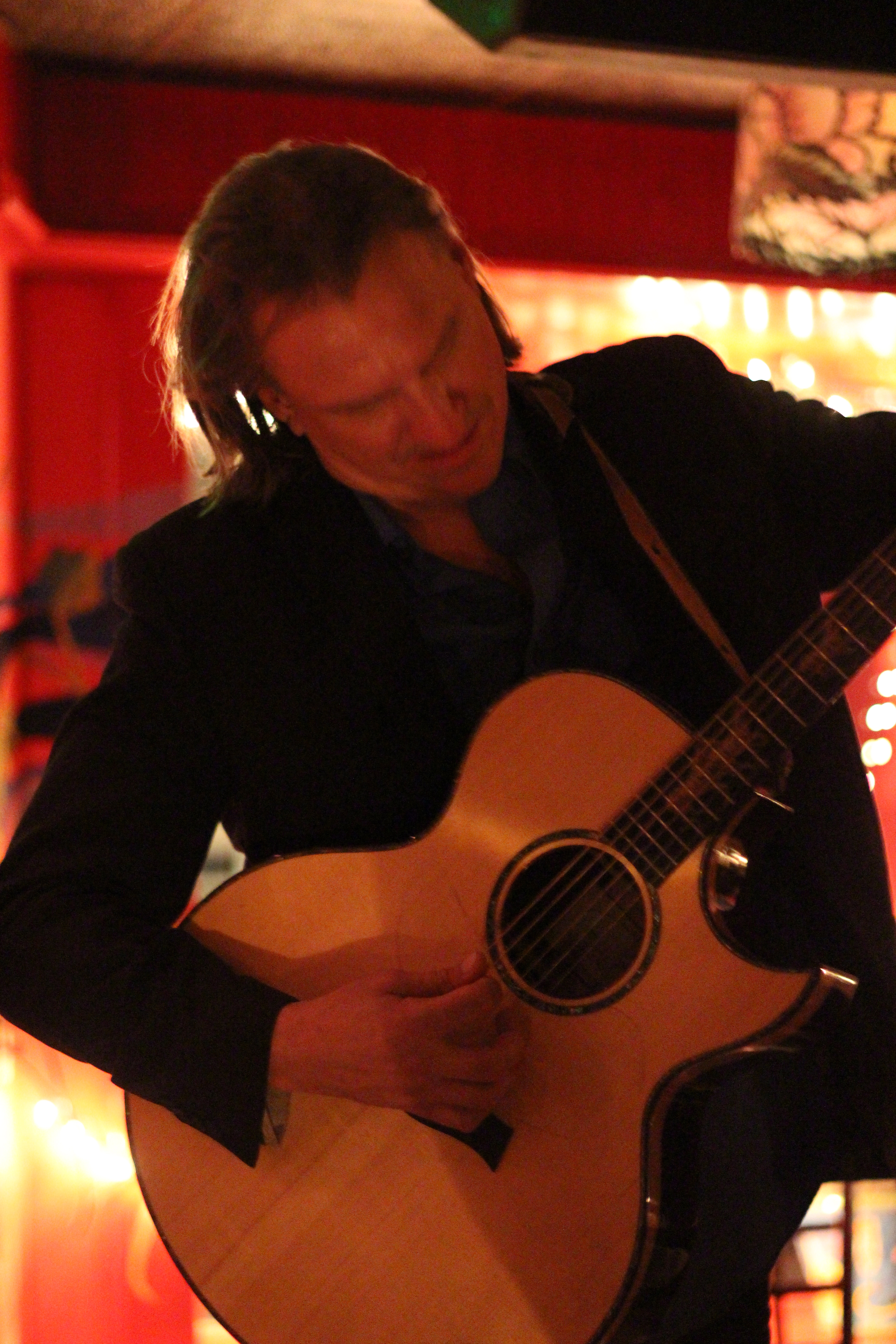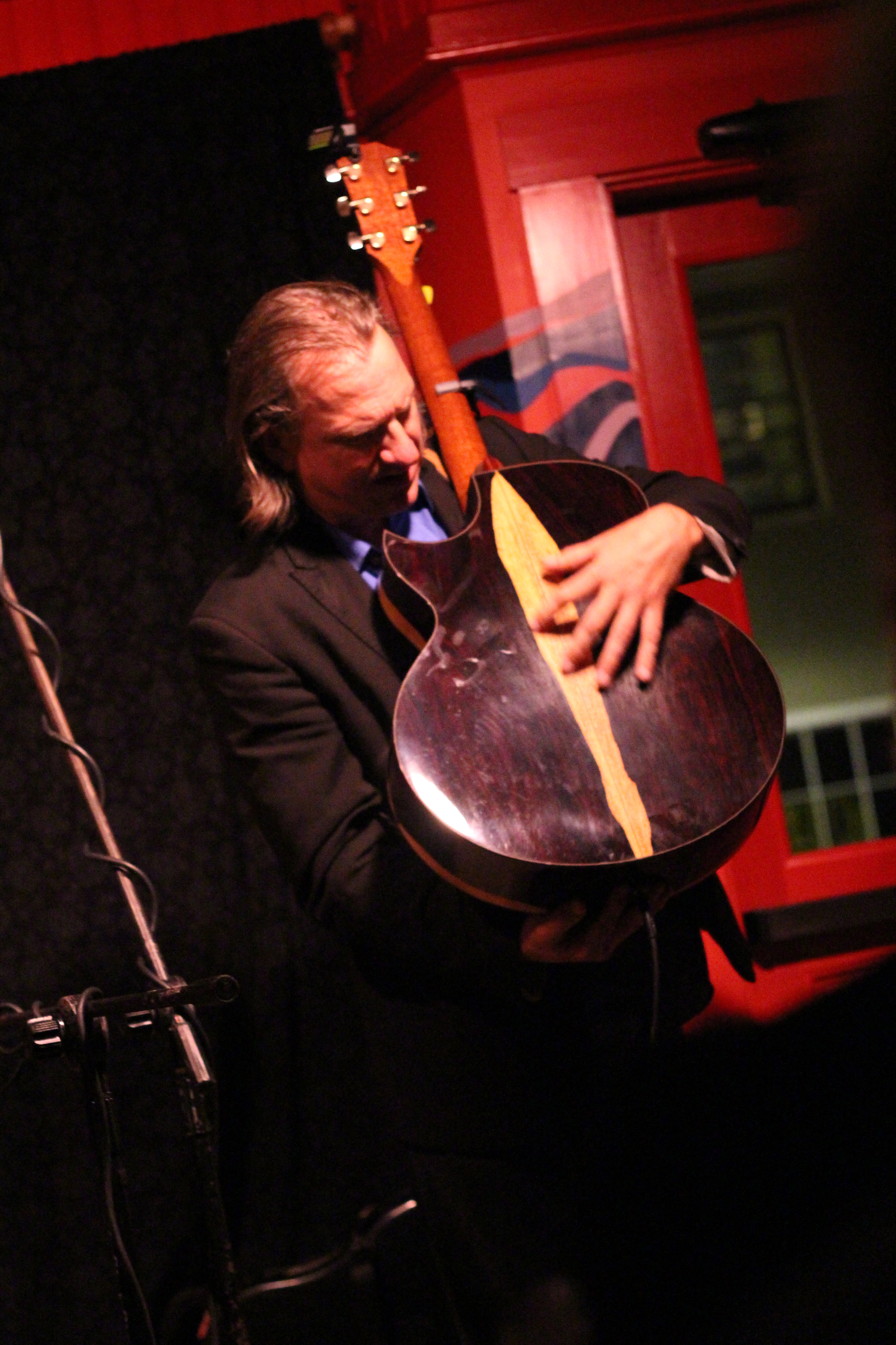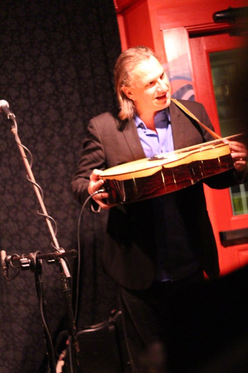 • Ellis and Rebecca unplugged and came out into the audience (to the head of my table) to sing “Annalee.” He caught me taking pictures of him while he tuned and told the story of the luthier in Virgina who repaired Guinness for him and made eye (not quite eye–camera?) contact with me. Those two pictures make me smile.
