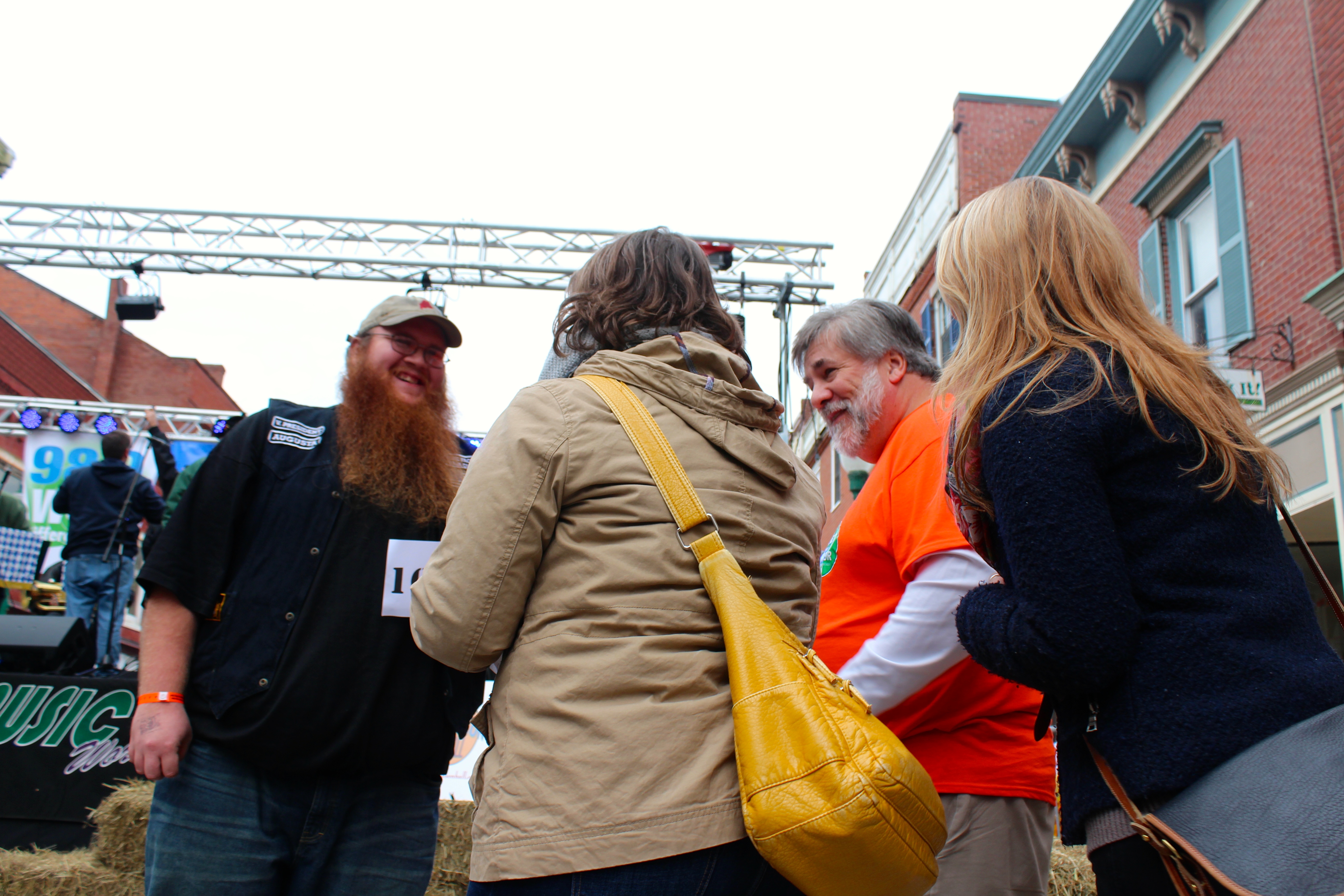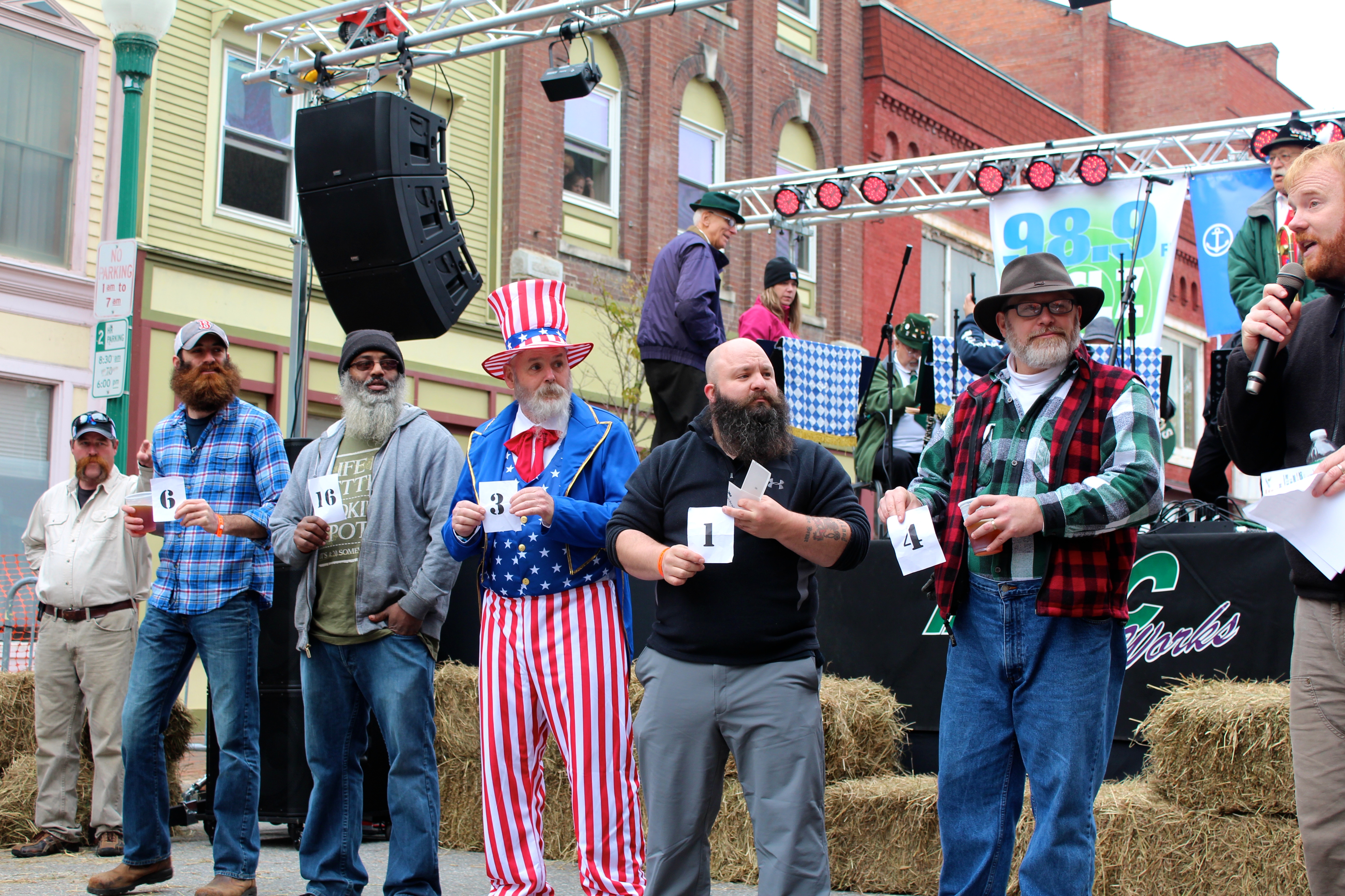 I loved the fun competitions and events that were planned for the day in between bands. The event that stole my heart, however, was the first-ever Swine and Stein Beard and Mustache Competition. Danielle Rodrigue, local beauty expert from Concepts Hair Design and and the MAYOR of Gardiner, Thom Harnett, were the other two judges, and I was thrilled to be asked to join them. I couldn’t believe my eyes when Patrick called contestants to the stage and a wave of beautifully bearded and mustachioed men approached the stage. Did you know there’s a Maine Facial Hair Club? What a great group of guys. We judged in six categories—beards more or less than six inches, partial mustache, freestyle, and a couple of others that I can’t recall since I was on cloud nine the whole time. Clare Marron, Gardiner Maine Street board member and owner of Monkitree, Gardiner’s fine art and craft gallery, organized the event. She worked with The Potter’s House to create amazing mugs (in honor of American Craft Week) for the winners of each category. The winners were thrilled with their surprise award.