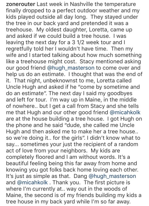 I think “Watch Over Us” is always going to be so stunning live that I catch myself holding my breath every single time. Zach told us the sweetest story about his daughters getting the idea they wanted to build a treehouse the day before he left for tour for three weeks. He and his wife wondered if their friend (and fellow Nashville musician) Hugh Masterson might be able to price out how much one would cost, and, without them knowing, their daughter called him to ask him to come over to do an estimate. Zach told us that his wife sent him a photo of Hugh and their friend Micah out in the backyard building his family a treehouse. He was stunned when he told us, “they built my children a treehouse. They are fellas with jobs, too. I feel so loved by my neighbors and I hope you’ll get to know your neighbors.” I took a couple of screenshots of the treehouse in progress from Zach’s Instagram account to share with you. There so much love in this, and we need it.